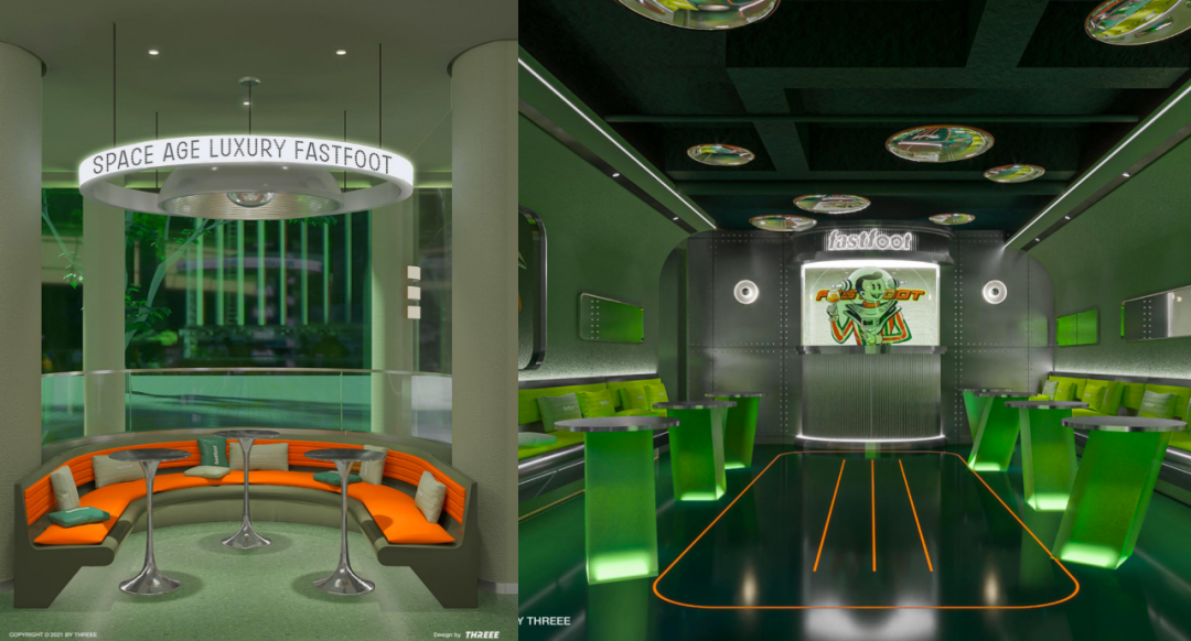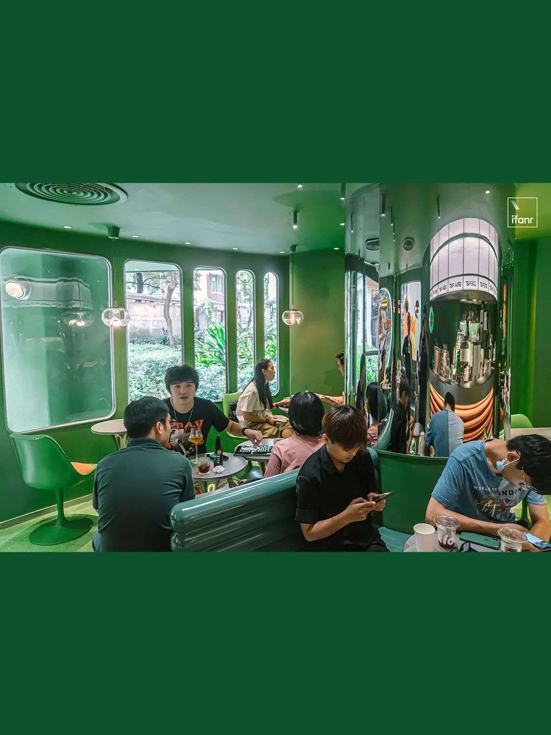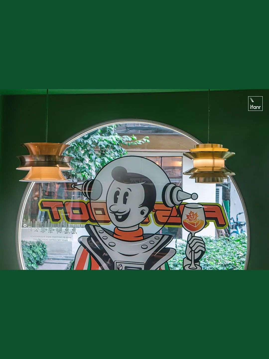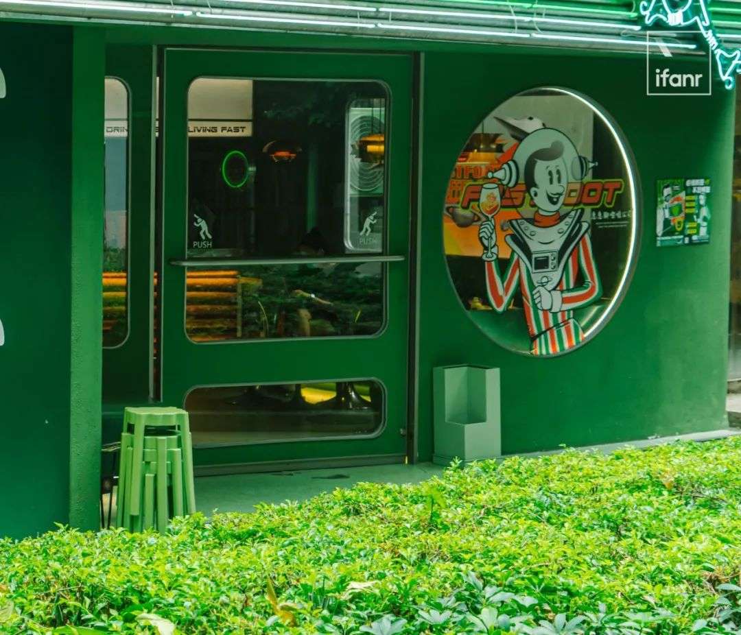 这家店被设计成 60-70 年代的太空时代风格,一个复古造型的卡通咖啡师在门口邀请,打开舱门,里面新旧元素撞击跳跃,遍布着深浅层次的绿。