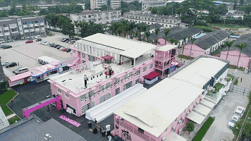 这里最开始有 6000 平方米的空间,园区里有楼房、咖啡馆、园林区等等,其中 9 号楼和 10 号楼全部被粉色铺满,柔软、温和、甜美,又带有一丝反叛色彩,完全击中了少女和猛男们的心。