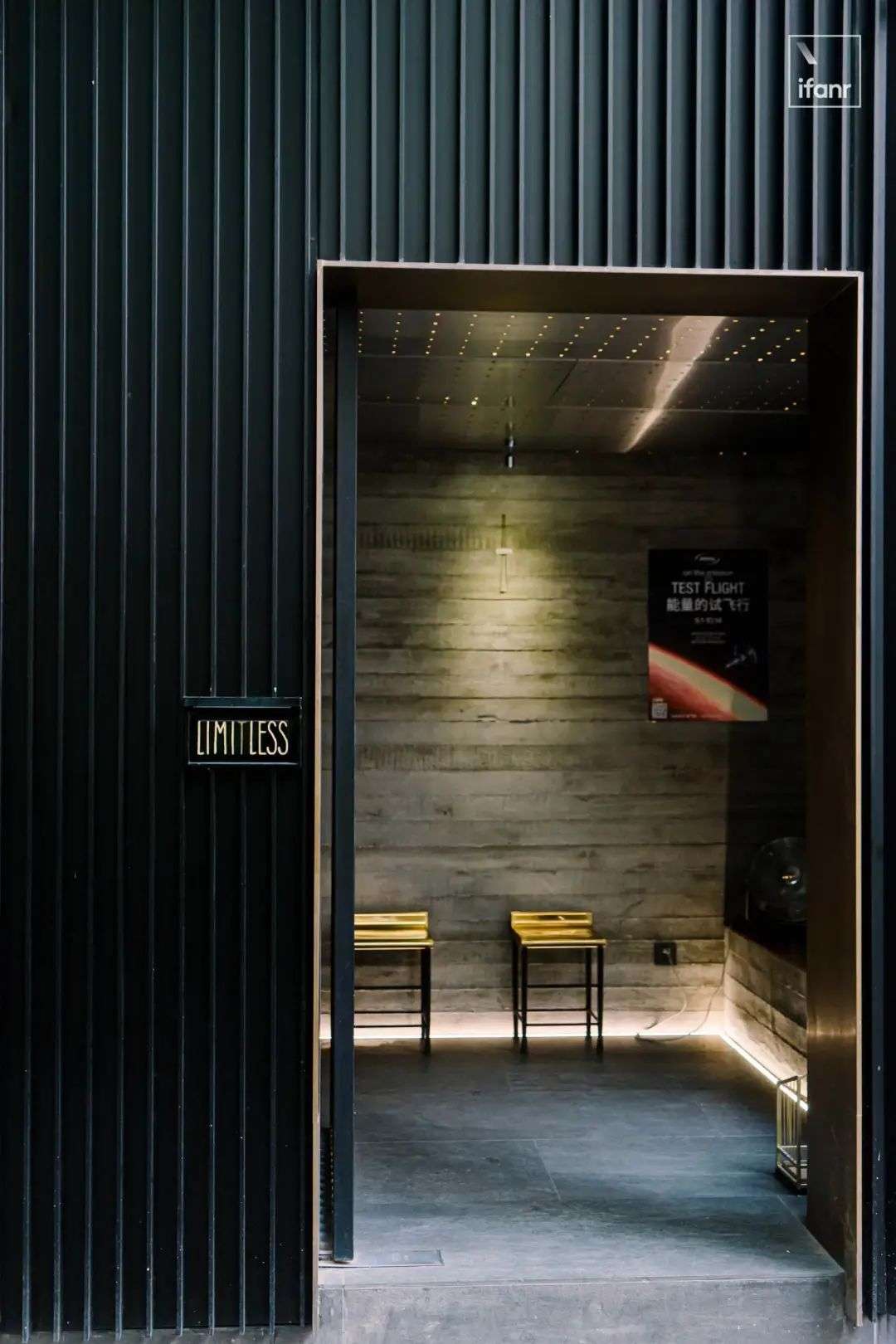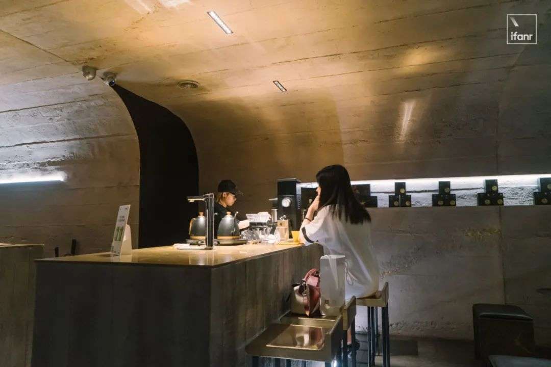 但进去之后,店内其实是另一番景象:它的确有着和门外黑色一样的神秘和冷漠,但又因为整面弯曲的侘寂水泥内墙,以及透出星星点点光亮的外墙,显露出了原始洞穴版的深邃感和寂寥感。