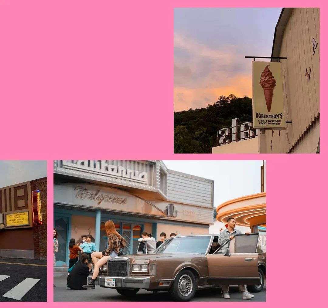 从霓虹灯加油站,到美式公路餐厅,粉色怀旧汽车,还有粉色围栏和极富年代感的海报,浓郁的复古风味让人已经仿佛身处异国他乡,正在一本街头杂志的拍摄现场。