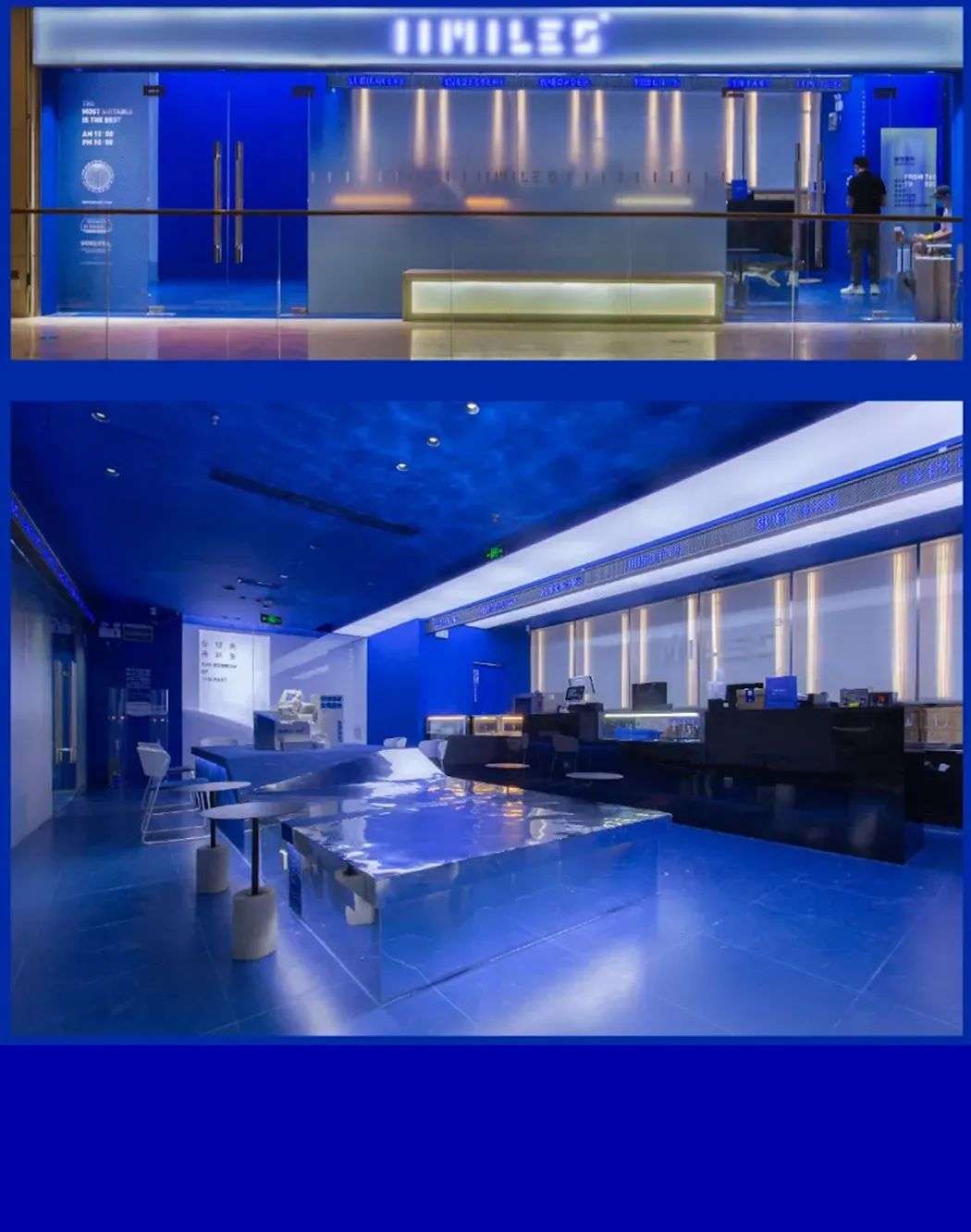 最开始关注到一家克莱因蓝茶饮店,是 11MILES,这家开在广州最核心地段的茶饮店,在克莱因蓝的覆盖下更加吸睛,让人联想起未来、新酷、个性等一系列关键词。