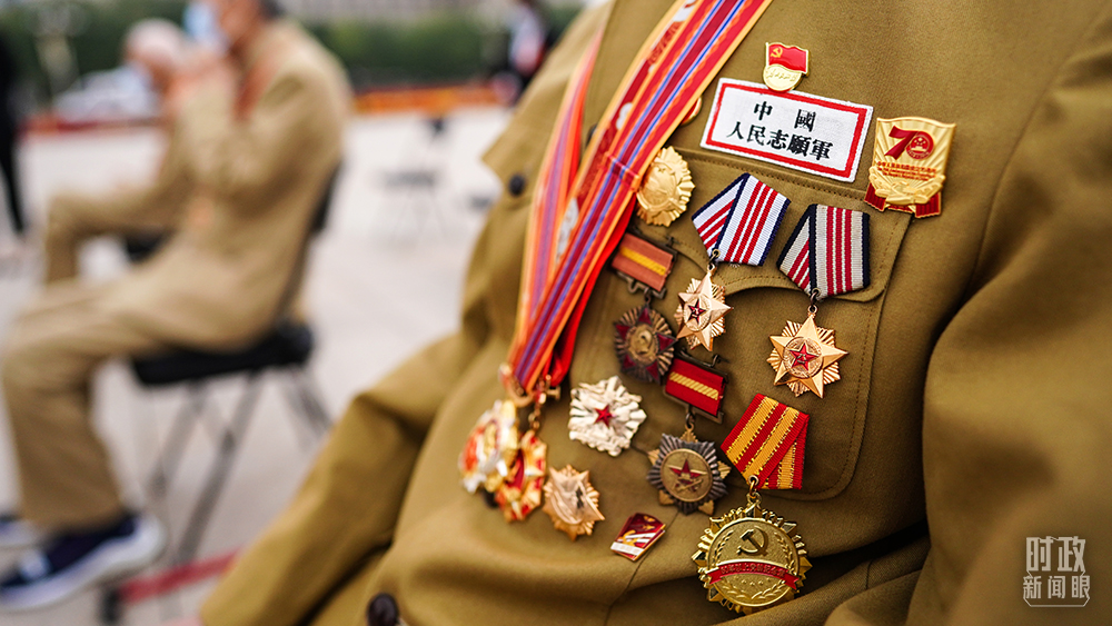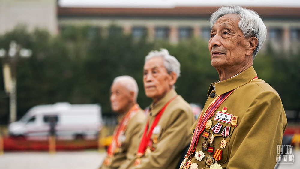 △87岁的抗美援朝志愿军老战士于志明在现场等待仪式开始。在2019年新中国成立70周年庆典上,于老曾是群众游行“致敬”方阵的一员。(总台国广记者李晋拍摄)