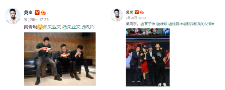 9月26日发微博@完《长津湖》主演朱亚文、胡军,跟朱亚文在网上快乐“斗图”后,9月28日,吴京又不忘在微博上挨个@《父辈》主演+导演的章子怡、徐峥、沈腾,讨论起P没P照片的问题……两部作品都得到了吴京“雨露均沾”的宣传造势,堪称新一代“端水大师”