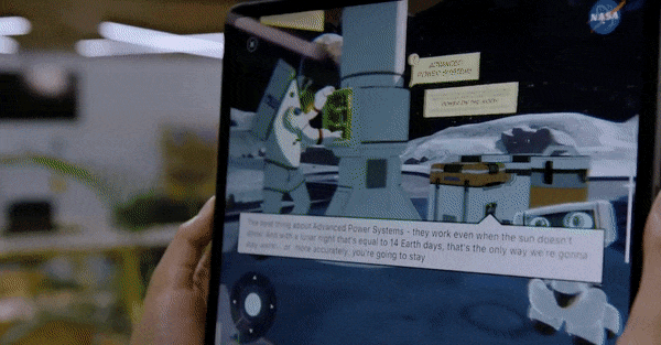 借助 AR 技术来到现实世界的 RT,会对着你做自我介绍,让你初步感受它在小说里的古怪个性和幽默细胞。紧接着,它的身后出现 3 个物体——宇航服、月球前哨、发射系统,点击图片就可以看到它们的 3D 形态。