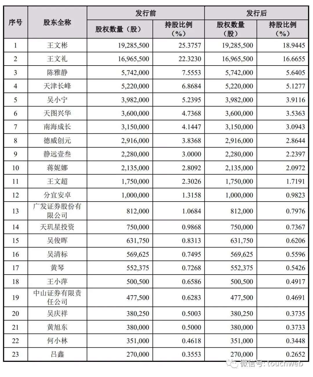 IPO后,王文彬直接持股为18.9445%,王文礼持股为16.6655%,陈雅静持股为5.6405%,天津长峰持股为5.1277%;吴小宁持股为3.9116%,天图兴华持股为3.5363%,南海成长持股为3.0943%。