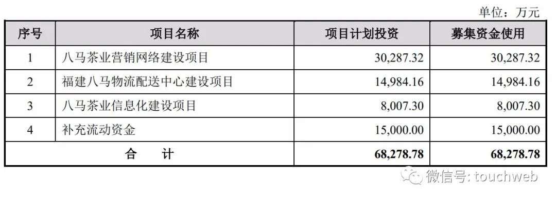 八马茶业计划募资6.83亿元,其中,3亿元用于八马茶业营销网络建设项目,1.5亿元用于福建八马物流配送中心建设项目,8007.3万用于八马茶业信息化建设项目,1.5亿元用于补充流动资金。
