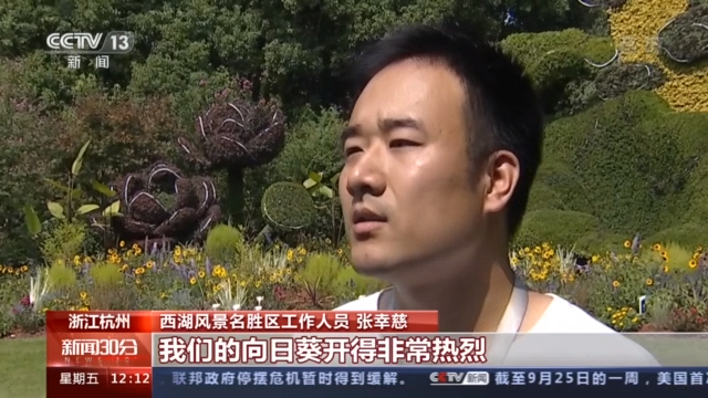 杭州西湖风景名胜区工作人员 张幸慈:游客一看就会发现我们的向日葵开得非常热烈,向日葵的颜色对视觉的冲击也非常大,让人能感受到秋天的气息,也非常有喜庆的效果。