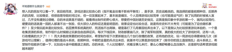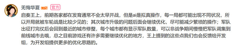 活动期间,《无悔华夏》运营和制作团队保持着和玩家的紧密联系,对于用户的游戏优化建议,官方给了大量诚恳的回复,可以看到游戏制作组对于用户体验的高度重视,也让玩家们感受到了制作组的真诚。