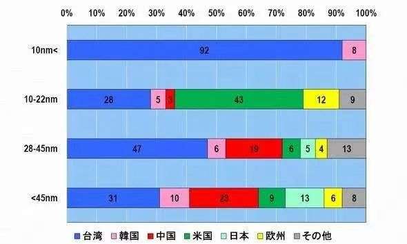 图4:逻辑半导体的各技术节点在各国、各地区的占比。(图片出自:eetimes.jp)