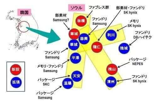 此处的“K半导体战略究竟是什么”?(下图5)。首先,从首尔近郊京畿道的板桥到器兴、华城、平泽、天安、温阳南北一条线,其次,从京畿道的龙仁到利川、阴城东西一条线,最后再从龙仁到槐山、清州东南一条线,正好形成字母“K”的形状,这就是韩国称之为“K半导体Belt”的原因。