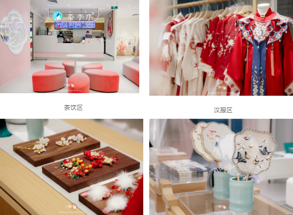 400㎡的门店空间被打造成“莲花仙境”,分为茶饮区、汉服区、配饰区、文创区四大区域,还设有试衣间。对于热衷国风的消费者来说,国风茶饮、汉服都是她们的“菜”,加上专为自拍而设的文化场景,能一次性满足多种需求,吸引力十足。