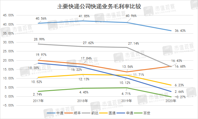 首先看的指标是“毛利率”。从下图中可直观看出,过去4年,快递公司的毛利率均呈下滑趋势,其中毛利率水平价高的有“中通、顺丰、韵达”,毛利率偏低的有圆通、申通、百世。