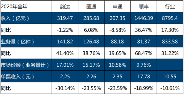 在“价格屠夫”的搅动下,几家头部快递公司不得不选择战略跟随,市场份额排名第一的中通2020年将战略从以前“份额-利润”的平衡,全面倒向“份额”;顺丰与三家“加盟制”快递公司纷纷调低单票收入,在全面价格战下,2020年快递行业单票收入出现10.6%的负增长。