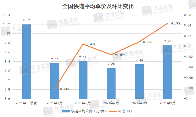 快递月度经营数据统计显示,全国快递平均单价7月份跌入9.26元/件的低点,8、9月份已连续两月回弹至9.75元/件,不过较一季度10.2元/件的价格仍有差距。