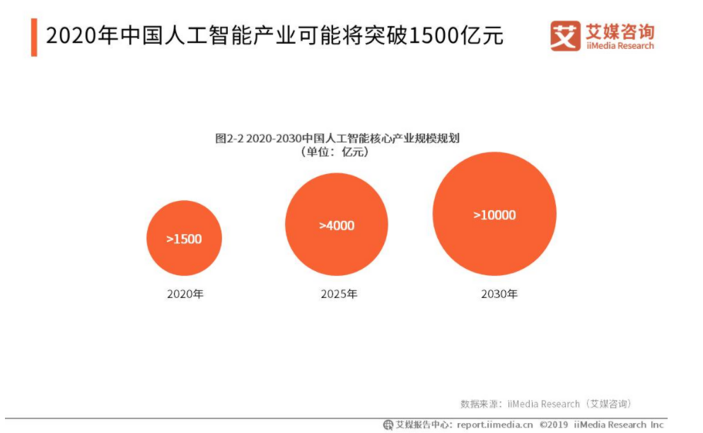 艾媒咨询的研报指出,当时中国IoT市场已经初具规模,人工智能企业数量超过3300家,位居全球第二,投融资总额高达785亿美元。该报告还预计,2020年中国人工智能产业可能突破1500亿元,到2025核心产业规模将超过4000亿元,2030年即有望突破万亿大关。
