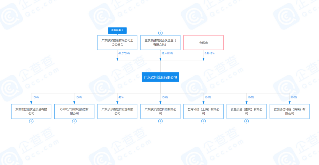 企查查提供的信息显示,OPPO广东移动通信有限公司是由欧加控股有限公司100%全资拥有的,而后者的第一大股东、实控人,则是欧加控股有限公司工会委员会。