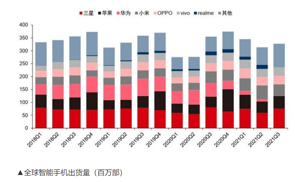 另一组数据同样令人担忧:2021年前三季度,中国智能手机出货量2.49亿部,同比2020年增长10.2%,同比2019年下降13.5%。