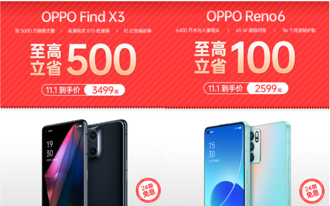 比如OPPO的色彩影像旗舰Find X3,活动期优惠500元,到手价只需3499。此外,OPPO K9和K9 Pro降价幅度分别为300和200;另一旗舰机型OPPO Reno6也有100元的降价,3200万自拍镜头和6400万像素的三摄设计相信能俘获不少买家的欢心。