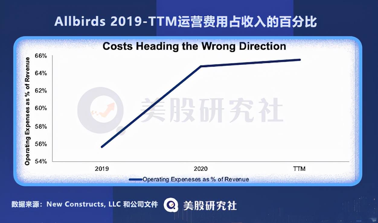 自2019年以来,Allbirds的运营费用一直在激增。其运营费用占收入的百分比从 2019 年的 56% 上升达到TTM的65%。