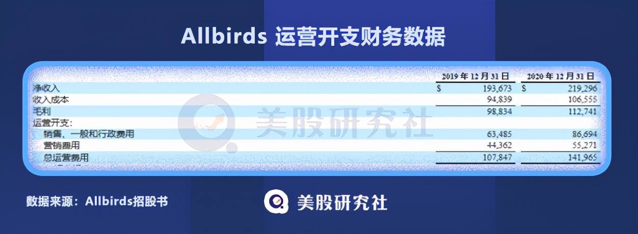 据招股书披露数据,Allbirds 2020年总运营费用为1.42亿美元,其中,销售、一般和行政费用为8669.4万美元,营销费用为5527.1万美元;2019年总运营费用为1.08亿美元,其中,销售、一般和行政费用为6348.5万美元,营销费用为4436.2万美元。