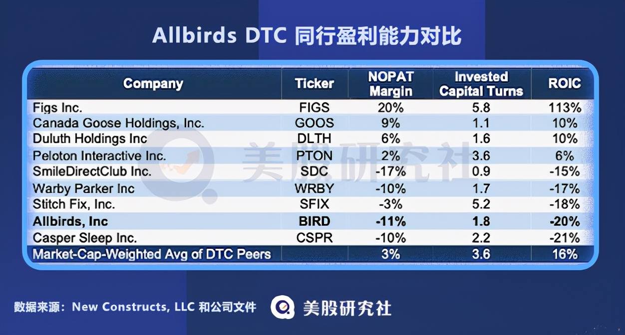 在众多运用DTC模式经营的公司中,Allbirds的投资回报率并不高。同行中的Figs投资回报率最突出,为113%;Stitch Fix投资回报率为-18%,Allbirds投资回报率为-20%,Casper Sleep投资回报率为-21%。