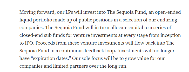 最重要的是,新的红杉基金,包括其子基金进行的一切投资,都将不再设定 回报期限。