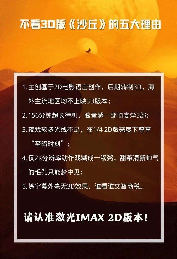 其中很重要的原因在于,《沙丘》全程采用的是 IMAX 2D 模式拍摄,再后期转制 3D 版本,而 2D 版本为 4K 片源,3D 版分辨率只有 2K,因此以 IMAX 2D 版本才为最佳。