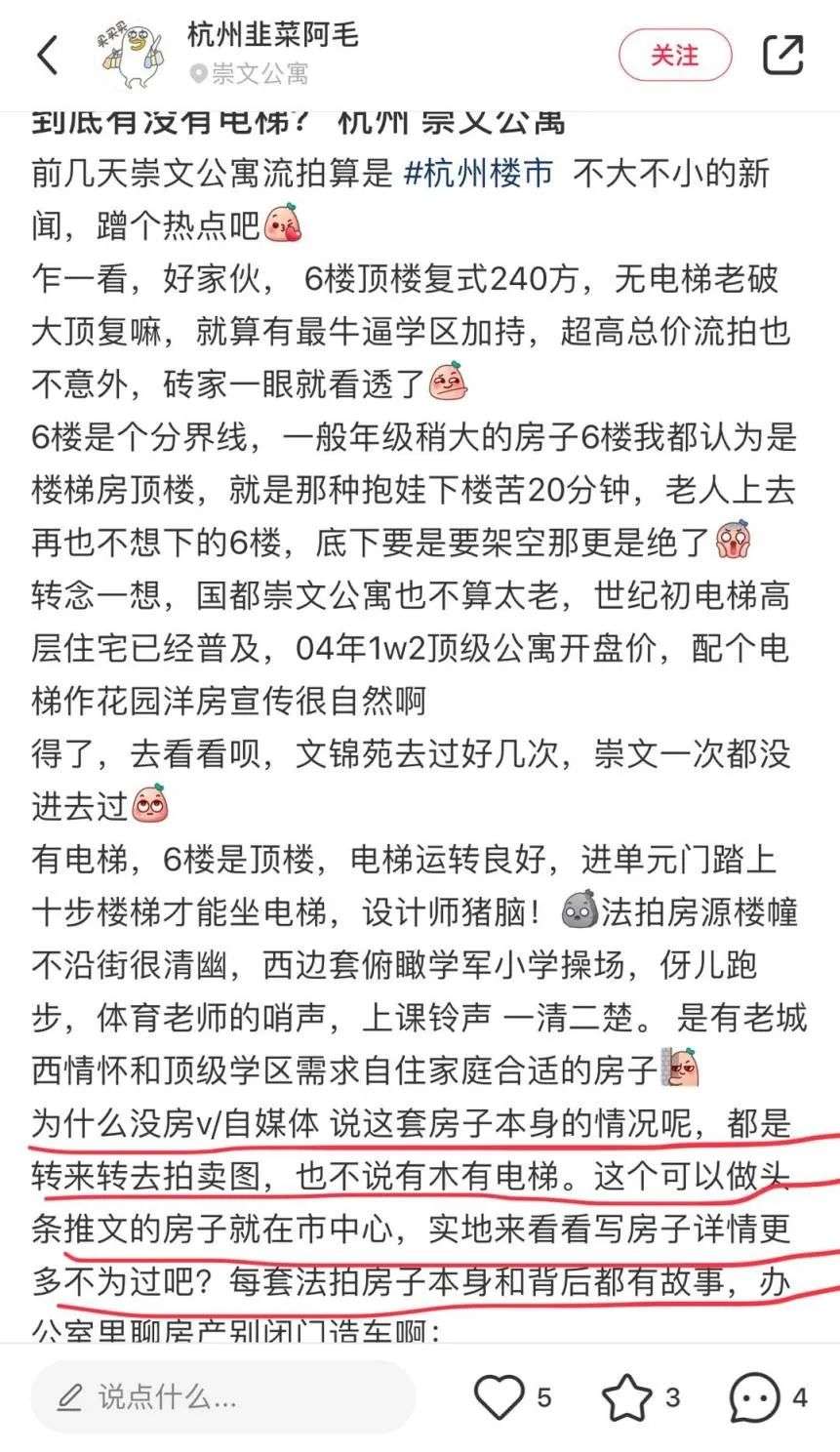 很多博主为了不错失热点与时间赛跑,在来不及亲身体验的情况下就开始写笔记为用户“种草”。小红书博主杭州韭菜阿毛就在介绍流拍杭州崇文公寓的内容中提到,很多博主的相关笔记真实转发房产的拍卖图,对于房子有没有电梯、周边环境如何并没有描述。