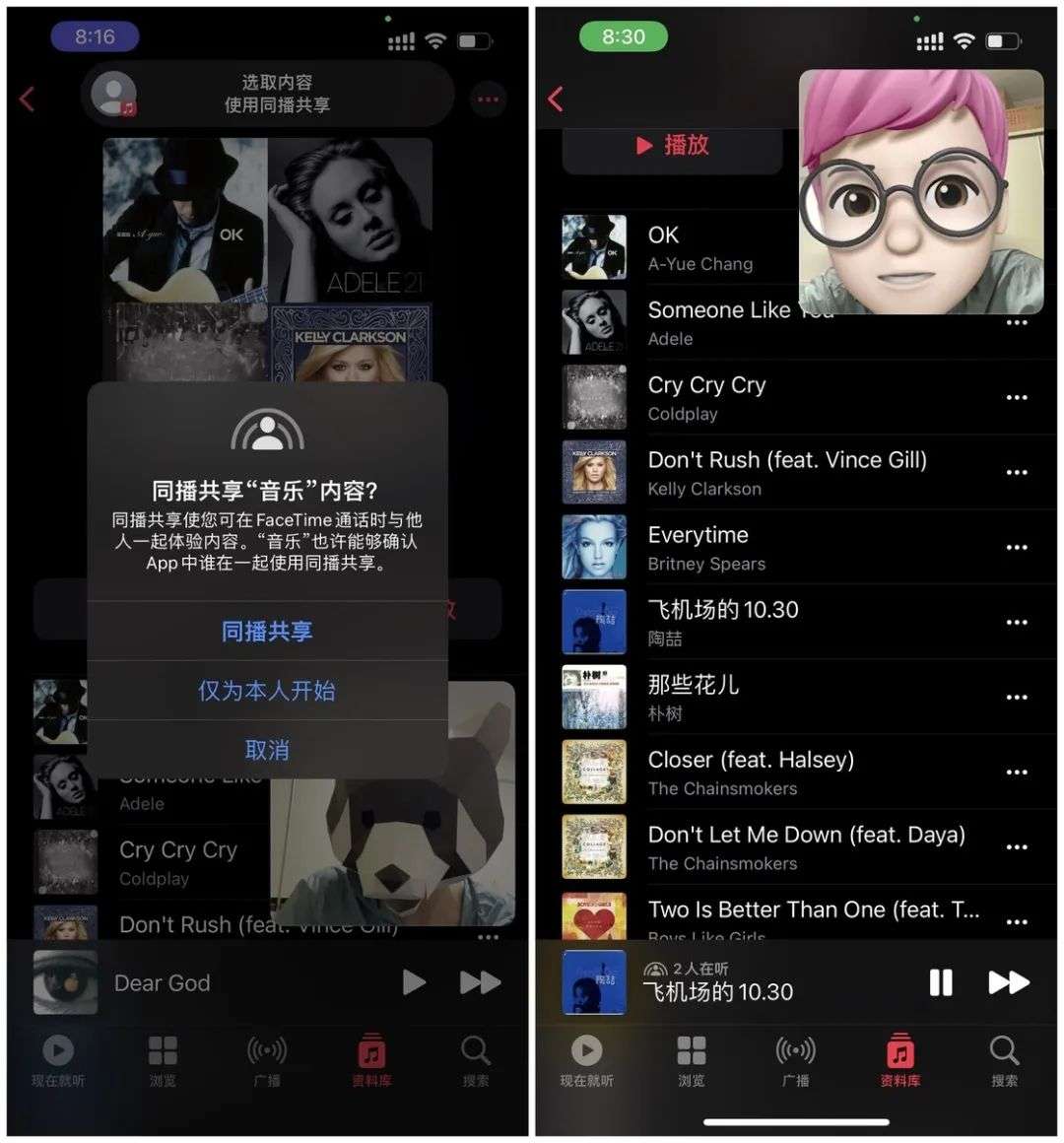 音频方面,SharePlay 目前只支持了苹果自家的 Apple Music,其它第三方音乐软件都还没有适配这个功能。Apple Music 在同播共享时的策略是「认订阅、认内容、不认区」,具体来说就是如果我订阅了美区的 Apple Music,对方订阅了国区的 Apple Music,并且确保共享的歌曲在美区和国区都有上架,那么就可以使用同播共享来一起听这首歌。