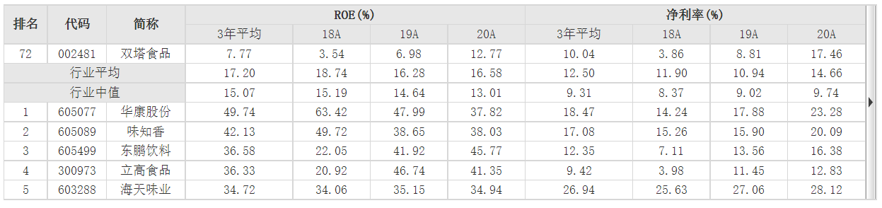 与同行业对比,双塔食品近三年平均净资产收益率(ROE)与净利率,均低于行业均值。