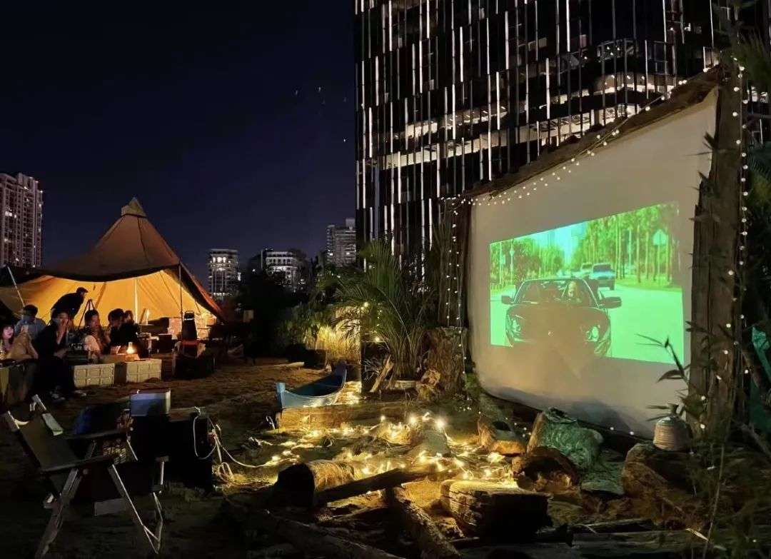 地上铺满细沙、支起沙滩椅,每晚播放电影,氛围感满满、出片率极高,吸引大批消费者前来打卡。