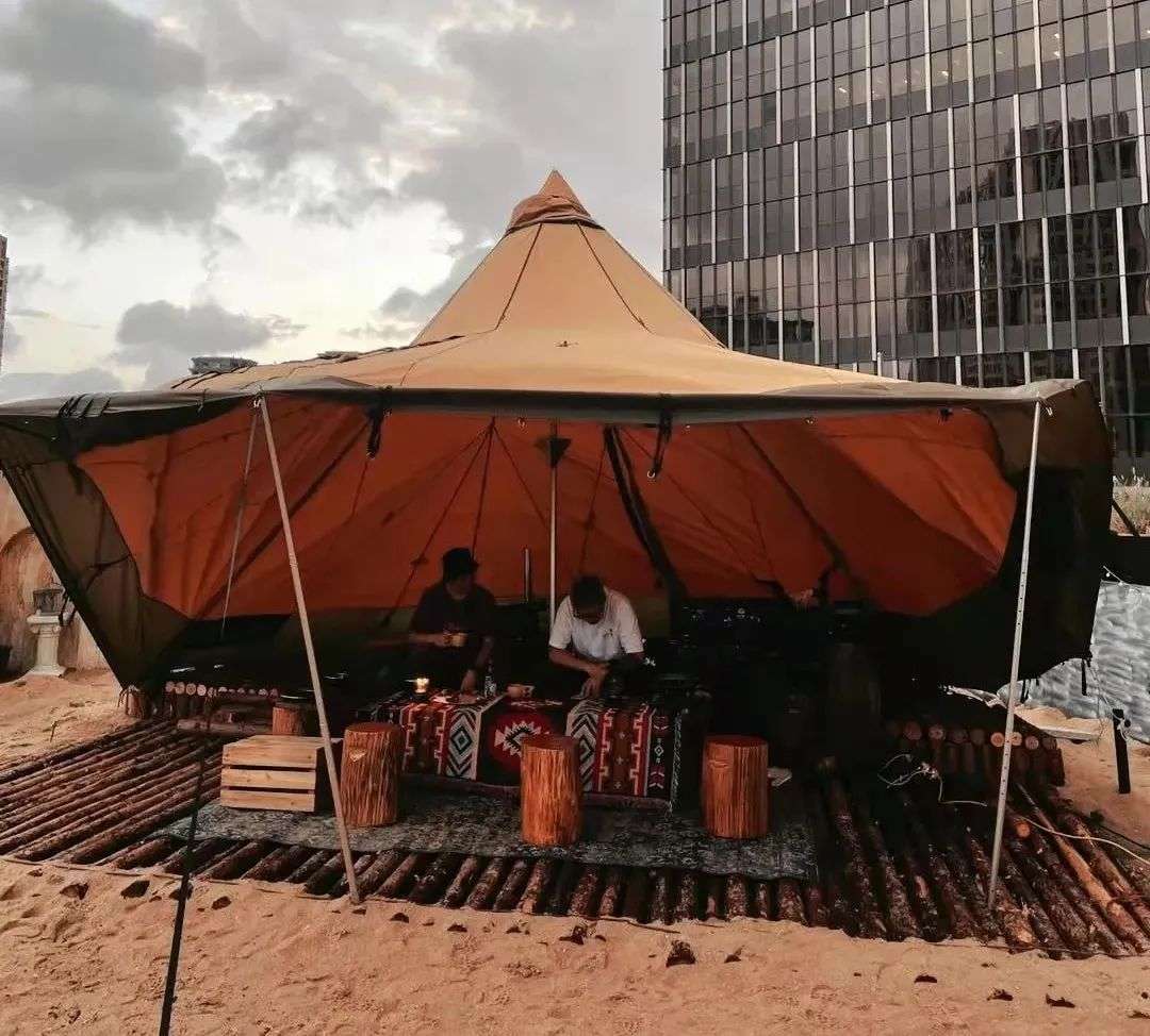 为了营造足够的“露营感”,GAT露语用的是非常“野”的帐篷类型,与周遭写字楼形成鲜明的对比。