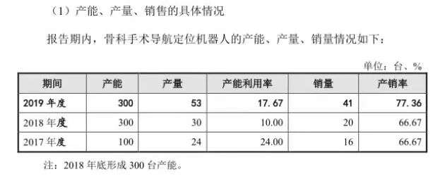 这款天玑机器人主要面向医院销售,销量虽不高,但逐年有上升。2018年-2020年分别销售了20、41、30台,产销率平均在70%左右。