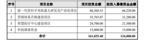 拟募资13.4亿元,用于新一代骨科手术机器人研发及产业化、智慧医疗中心建设、营销体系升级建设、科技储备资金四方面。
