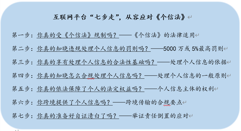 我们特此梳理互联网平台(仅针对作为个人信息处理者的情形,下称“平台”)从容应对《个信法》的“七步”秘诀,帮助平台为《个信法》交出合格的答卷。
