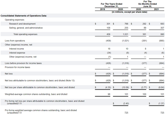 但Rivian在招股书中也坦承,“目前为止尚未获得实质性收入”,并面临着巨额亏损。招股书显示,Rivian在2019年、2020年运营亏损分别为4.09亿美元、10.21亿美元;2021年上半年运营亏损为9.94亿美元且营收为0。