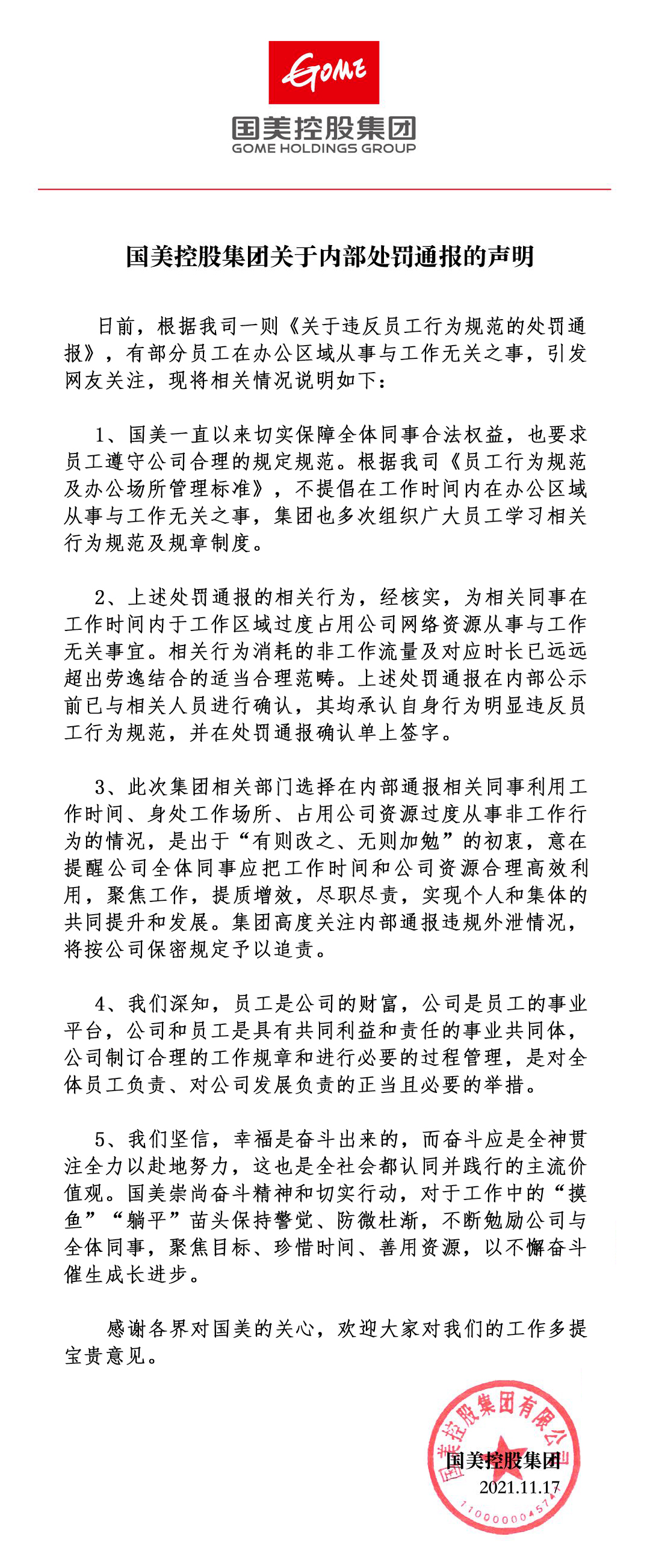 最终,当事人国美坐不住了。11月17日晚,国美在官微发表关于内部处罚通报的声明。声明称,除了重申不提倡在工作时间内在办公区域从事与工作无关之事外,国美高度关注内部通报违规外泄情况,将按公司保密规定予以追责,并指出员工是公司的财富。
