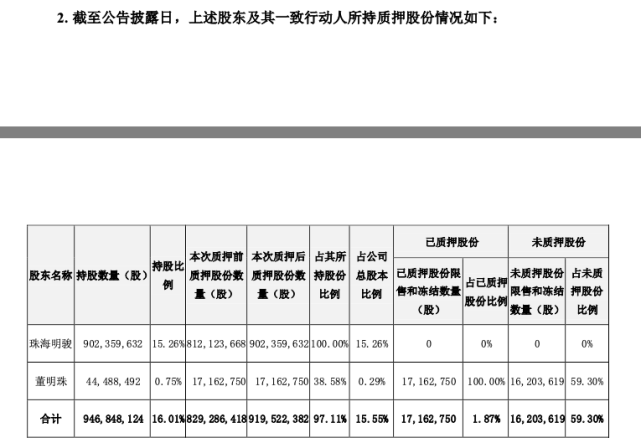 公告显示,11月19日,珠海明骏将其持有公司的9024万股股票补充质押给农业银行珠海分行,占其所持股份比例10%,占公司总股本比例1.53%。同时,截至2021年11月19日,珠海明骏及其一致行动人董明珠质押股份共计9.2亿股,占其所持公司股份数量比例达到97.11%。