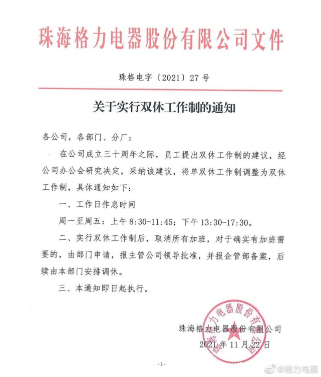 11月22日,格力电器发布通知,宣布全面实行双休工作制,这是继去年美的集团宣布双休制后,第二家宣布双休制的家电巨头。“太开心了,马上把周六的闹钟取消。”一位格力员工告诉时代财经。