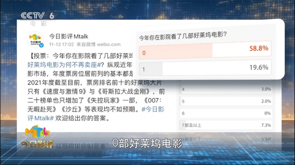 此前,《今日影评》曾在官方微博发起“今年你在影院看了几部好莱坞电影”投票,其中超半数参与者选择了“0”,即今年还没有在电影院看过任何一部好莱坞电影。这一结果稍稍出乎师烨东的预料,“没想到比例这么大。”他向《今日影评》坦言,“好莱坞”三个字一度是陪伴几代电影观众成长的金字招牌,但近年来似乎已然审美疲劳。