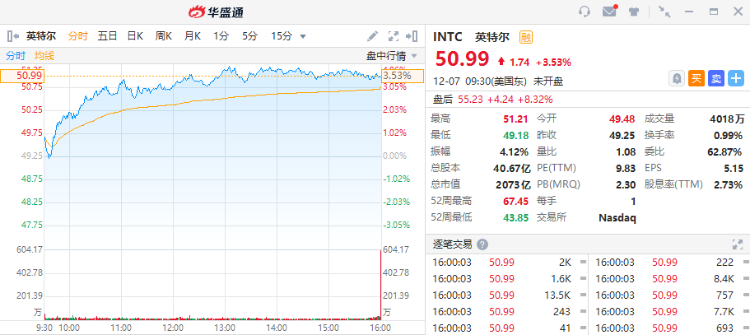 该消息推动英特尔股票盘后走高涨逾8%,最新股价报50.99美元/股。
