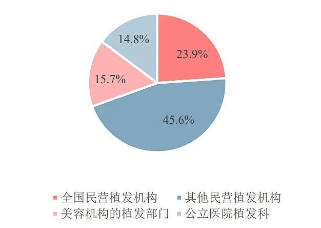 数据显示,包括雍禾、碧莲盛、大麦、新生的民营连锁类的植发企业只占总数的23.9%。民营非连锁植发机构占比最高,达到了45.6%。剩下的是占比15.7%的民营医美机构的植发科室和占比14.8%的公立医院植发科室。