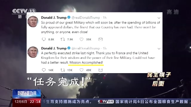 “任务完成!”——美国前总统特朗普2018年4月14日在推特上兴奋地说,美国、英国和法国“完美地执行”了针对叙利亚的军事打击。