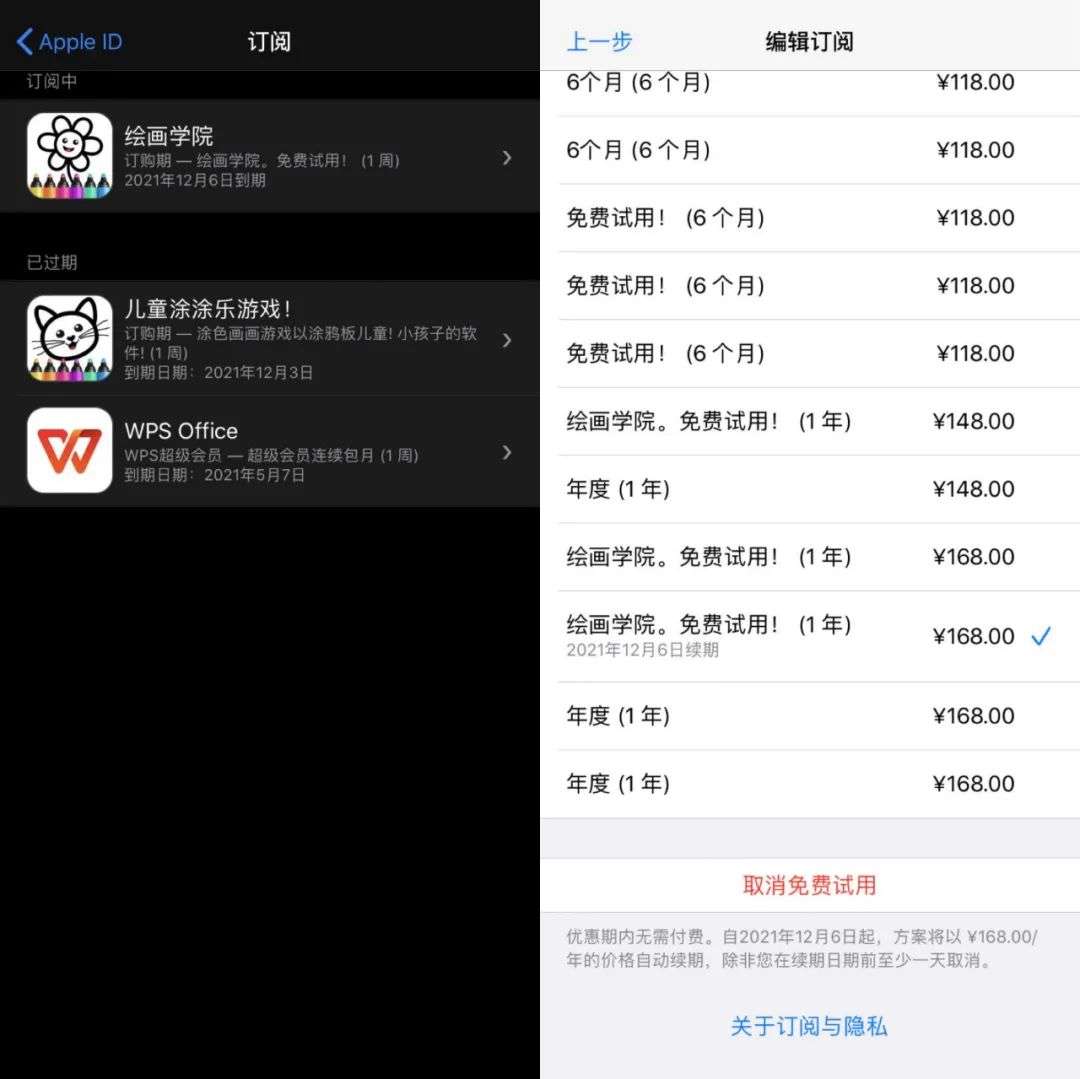 最近,《IT时报》记者尝试下载了一款儿童涂涂乐游戏《绘画学院》,默认选择每月28元会员费才能获取7天免费试用的权限,但没有选择免费试用也能解锁部分图画,而另一款同类型App《儿童涂涂乐游戏》则没有明显的免费试用提示。一波操作后,用户很容易遗忘在哪个App开通了自动续费,或者小朋友在无意识的状态下解锁了免费试用。