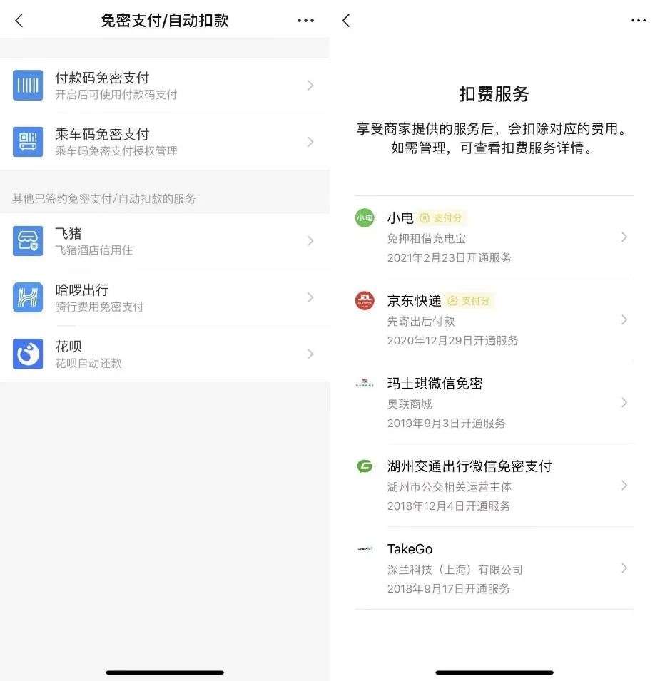《IT时报》记者一一检查了自己在支付宝和微信上的自动扣款项目,支付宝开通了飞猪信用住、哈啰出行和花呗的免密支付,基本都是阿里系生活服务;而在检查微信自动扣款项目时“惊吓”更多,开通了小电共享充电宝、京东快递、玛士琪无人货柜等生活服务的免密支付,部分在三年前就开通的项目,已经被遗忘在尘埃里。