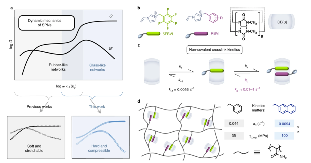 图|玻璃状SPNs的设计。a.SPNs的动态机制示意图(上);b.全氟苯基(5FBVI)、取代苯基(RBVI)客体和宿主大环的分子结构;c.包括第一和第二缔合的主体增强极性π-π相互作用的三元络合平衡及其相关动力学参数;d.由上述相互作用和两个RBVI客体交联的超分子聚丙烯酰胺网络表现出缓慢的解离动力学和高抗压强度。(来源:该论文)