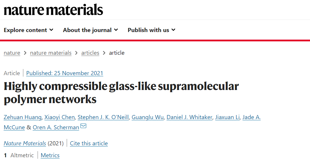相关研究论文以“Highly compressible glass-like supramolecular polymer networks”为题,已发表在科学期刊 Nature Materials 上。