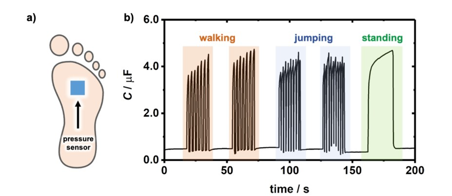 研究人员将该传感器放置在脚底,成功实现了对三种运动(行走、跳跃、站立)的实时监测。在实时监测过程中,人体分别进行了 10 s行走、跳跃和站立的动作。在每个动作中,研究人员观察到了一致的电容变化,而且该材料在每次形变之后,都可以完全自我恢复。