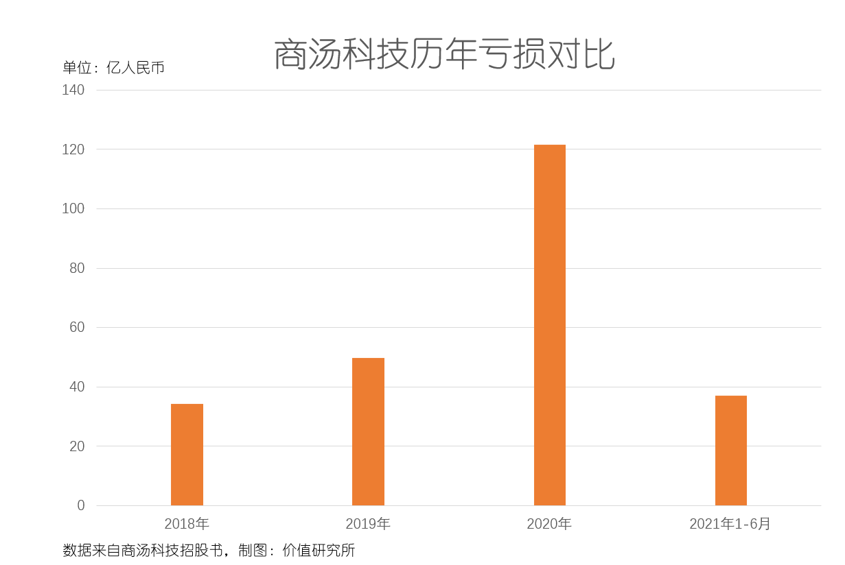 招股书显示,商汤科技2018-2020年亏损分别为34.33亿、49.68亿和121.58亿,今年上半年亏损额也高达37.13亿,三年半合计巨亏超过240亿。其中,2020年亏损同比增速高达200%,揭示了商汤科技在成本控制上的缺陷。