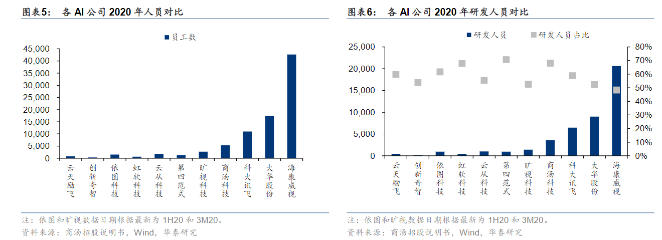 以研发团队规模而论,商汤科技当前研发人员约为3500人,仅为海康威视的17%,大华股份的40%。